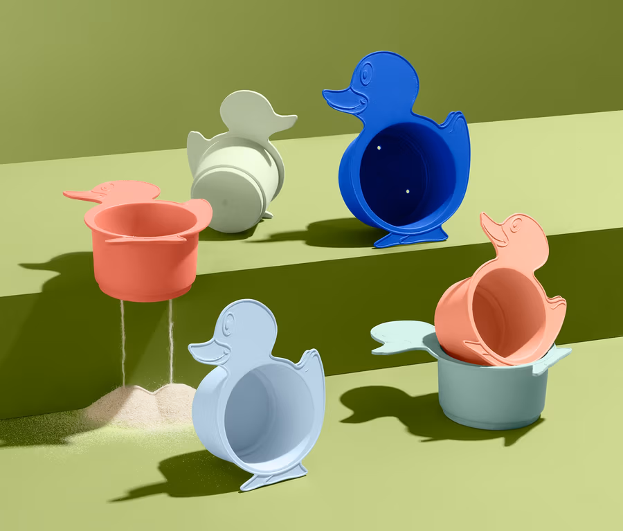 Wo Wasser, Sand und Matsch sind, da ist auch der Spaß meist nicht weit entfernt. Und mit diesen sechs farbenfrohen Sandspielbechern in Entenform wird der besonders vielfältig. Die Förmchen eignen sich zum Spielen mit Sand am Strand ebenso wie zum Planschen in der heimischen Badewanne. Drei davon sind unten geschlossen, die anderen drei haben Löcher zum Ablaufen des Wassers. Ihr BPA-freies Material kommt ohne Phthalate aus und ist zu 85% aus nachhaltigem Zuckerrohr. Und nach dem Spielen lassen sie sich ineinander gesteckt zu einem kleinen Türmchen stapeln. Bis zum nächsten Mal.