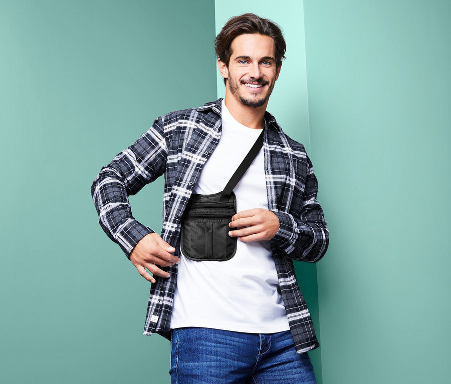 Perfekt für alles, was unverzichtbar, lieb und teuer ist. In dieser Sicherheitstasche mit Schultergurt lassen sich Wertsachen und zum Beispiel Reisedokumente, wie der Reisepass, sicher überallhin mitnehmen. Die kleine Umhängetasche ist besonders flach sowie anschmiegsam und lässt sich dadurch sowohl über als auch unter der Kleidung tragen.