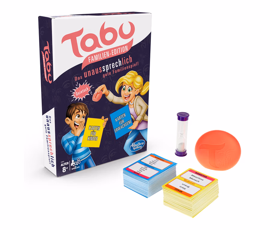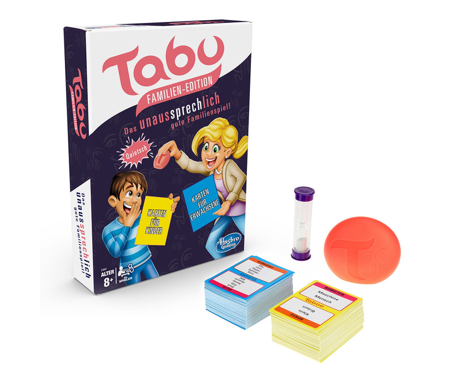 Einen Begriff mit vielen Worten zu erklären, ist eigentlich ganz einfach. Schwierig wird es nur, wenn man die naheliegendsten Begriffe nicht nutzen darf. Und genau das ist die Idee beim kommunikativen Gesellschaftsspiel »Tabu«. Gegen die Uhr muss ein Team erraten, was der Mitspieler Wortreich und mit Händen und Füßen zu beschreiben versucht. Rutscht ihm ein auf der Karte stehendes Tabuwort raus, gibt es einen Punktabzug. Das Spiel lässt sich im kleinen Familienkreis ebenso gut spielen, wie mit Freunden auf der Party. In dieser Familien-Edition sind außer der Sanduhr und dem Quietschball auch zwei Kartendecks enthalten: Das Standard-Set mit 130 Karten für Erwachsene und das Kinder-Set mit ebenfalls 130 Karten, auf denen aber je nur zwei Tabuwörter angegeben sind.