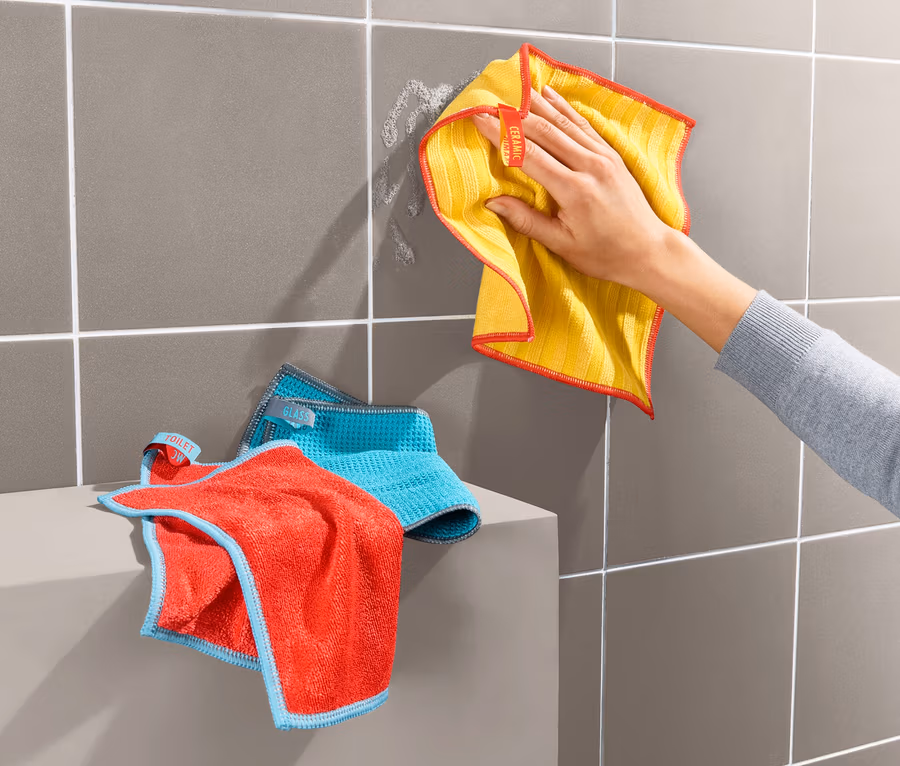 Das gelbe Tuch ist der Spezialist zum Reinigen von Keramik und ähnlichen Oberflächen. Das türkisfarbene Tuch bietet sich an zur besonders schonenden Reinigung empfindlicher Oberflächen wie beispielsweise lackiertes Holz oder Glas – und das rote Tuch schließlich kommt am besten zum Einsatz, wenn die intensive Reinigung bei besonders starken Verschmutzungen gefragt ist.