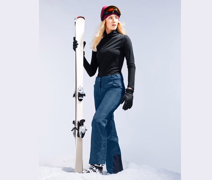 Ein wasserdichter Schneefang mit rutschhemmender Gummierung hindert das kalte Nass daran, in die Hose zu gelangen, eine strapazierfähige Verstärkung an den Beininnenseiten macht sie widerstandsfähiger und die vorgeformte Kniepartie verbessert die Passform. Geschlossen wird die Wintersportkleidung mit einem verdeckten Reißverschluss und zwei Haken, Platz bietet sie in zwei Eingrifftaschen und zwei Gesäßtaschen.