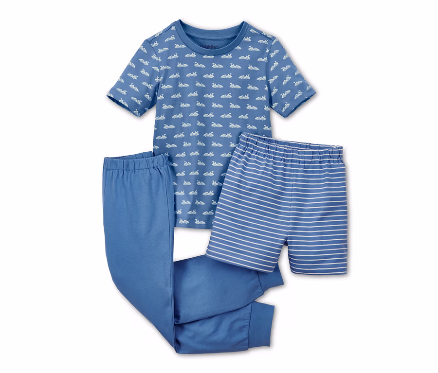 Mit dieser Pyjama-Kombi finden die Kleinen bei jeder Temperatur zu einem erholsamen Schlaf und schönen Träumen. Das Set besteht aus einem T-Shirt, Shorts und einer langen Hose – so hat man immer die Wahl, je nach Situation und Vorliebe.
