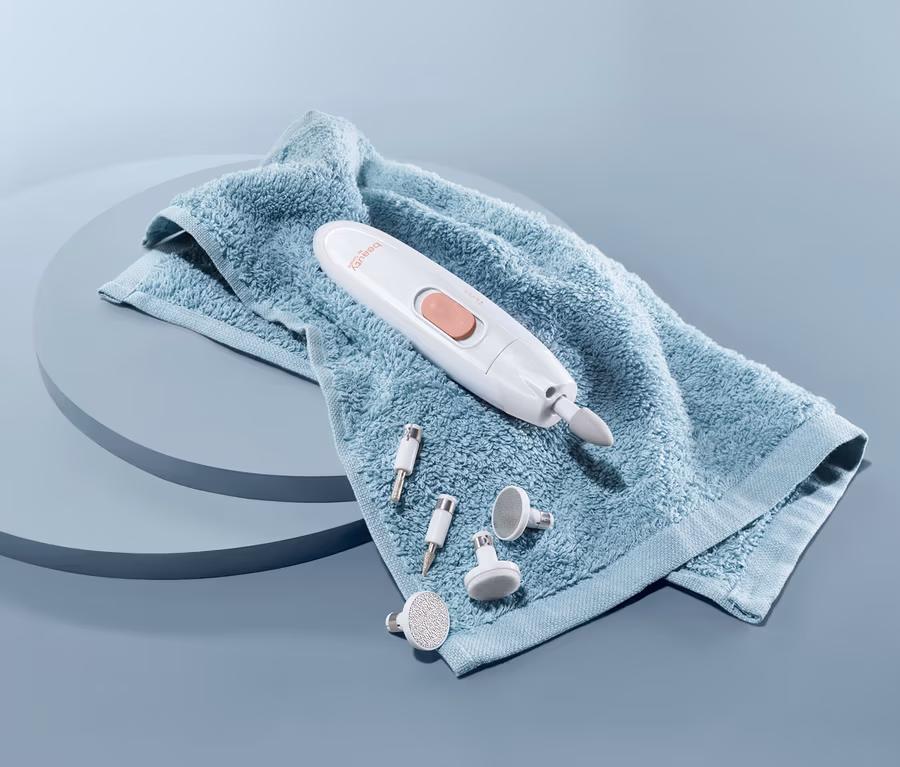 - 6 verschiedene Aufsätze: zum Kürzen der Nägel, zum Polieren oder zum Entfernen von Horn- und Nagelhaut
