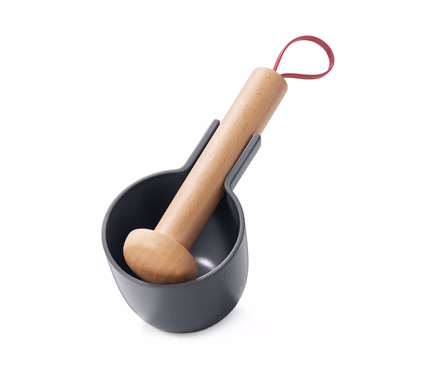 Dieser Mörser hat eine Aussparung zum präzisen Ausschütten des Inhalts – die auch zum Einklinken des Stößels dient. So kann man den Küchenhelfer wie einen Kochlöffel aufhängen und hat ihn immer griffbereit. Dank seiner dunklen, edlen Optik eignet er sich auch zum Servieren der frisch zubereiteten Kreationen.