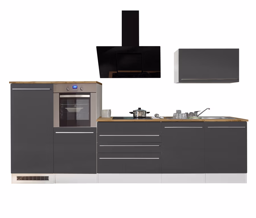 - Inkl. Edelstahl-Einbauspüle mit Ab- und Überlaufgarnitur, Hängeschrank 90 cm, Spülenunterschrank 50 cm, Nische mit Dekorblende für Einbaugeschirrspüler 60 cm, Kochfeldunterschrank 90 cm, Arbeitsplatten, Stärke 38 mm, Backofen-Umbauschrank 60 cm, Kühlschrankumbau 60 cm, Einbaubackofen, Einbaukühlschrank, Einbaugeschirrspüler, Glaskeramikkochfeld, Dunstabzugshaube: kopffreie Schräghaube, Montagematerial und -anleitung