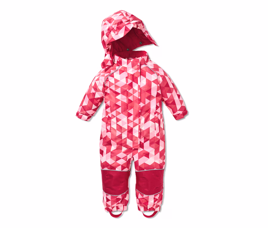 Das Obermaterial ist im grafischen Dessin gestaltet und mit versiegelten Nähten gearbeitet. Dadurch ist es ebenso winddicht wie atmungsaktiv und hält einer Wassersäule bis 3.000 mm stand. Seine umweltschonende ecorepel®-Imprägnierung macht es außerdem schmutzabweisend. Der Schneeanzug hat eine Windschutzleiste mit Klettverschluss und ist im Knie- und Gesäßbereich verstärkt, damit es halb so wild ist, wenn man mal hinfällt. Die elastischen Ärmelbündchen lassen sich mit Klettverschlüssen in der Weite regulieren und fixieren, die ebenfalls elastischen Fußstege verhindern zuverlässig, dass die Beine hochrutschen. Die Kapuze ist abnehmbar und Reflektoren auf Vorder- und Rückseite erhöhen die Sichtbarkeit.