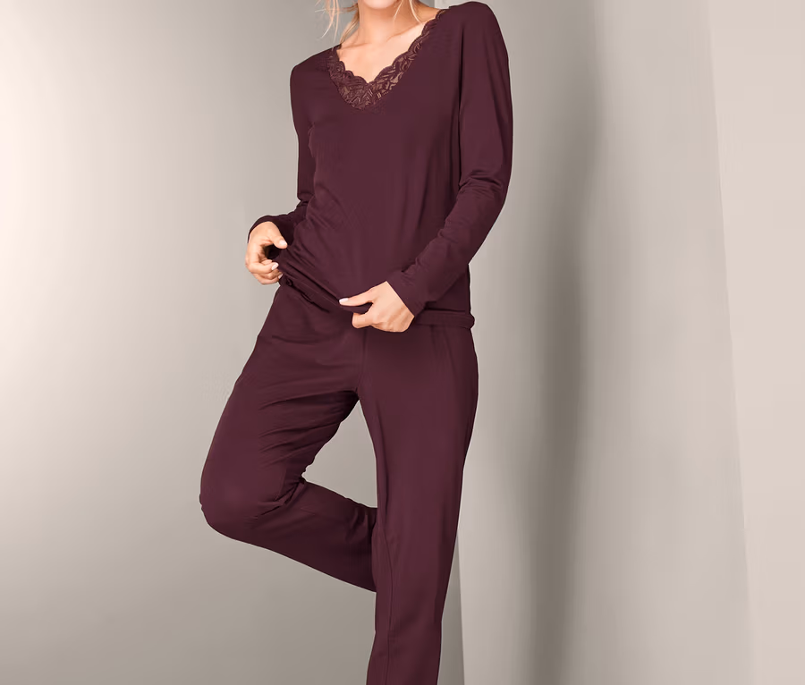 Der Damen-Schlafanzug in edlem Bordeauxrot hat eine Hose mit bequemem, elastischem Bund sowie ein Oberteil mit V-Ausschnitt. Und damit auch die Optik nicht zu kurz kommt, ist er am Hals und an den Beinabschlüssen mit zarter Spitze besetzt.