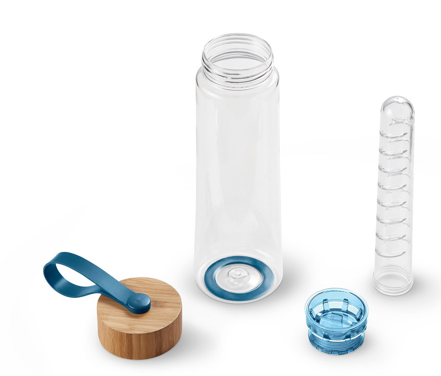 Das Besondere an dieser Trinkflasche ist aber ihr herausnehmbarer Aroma-Einsatz, der wie ein Teesieb funktioniert und verhindert, dass einzelne Teile oder Blätter ins Getränk gelangen. Die Flasche fasst etwa 800 Milliliter und ist aus hochwertigem, BPA-freiem Kunststoff gefertigt. Sie hat eine Trageschlaufe und kann auch für kohlensäurehaltiges Wasser genutzt werden.