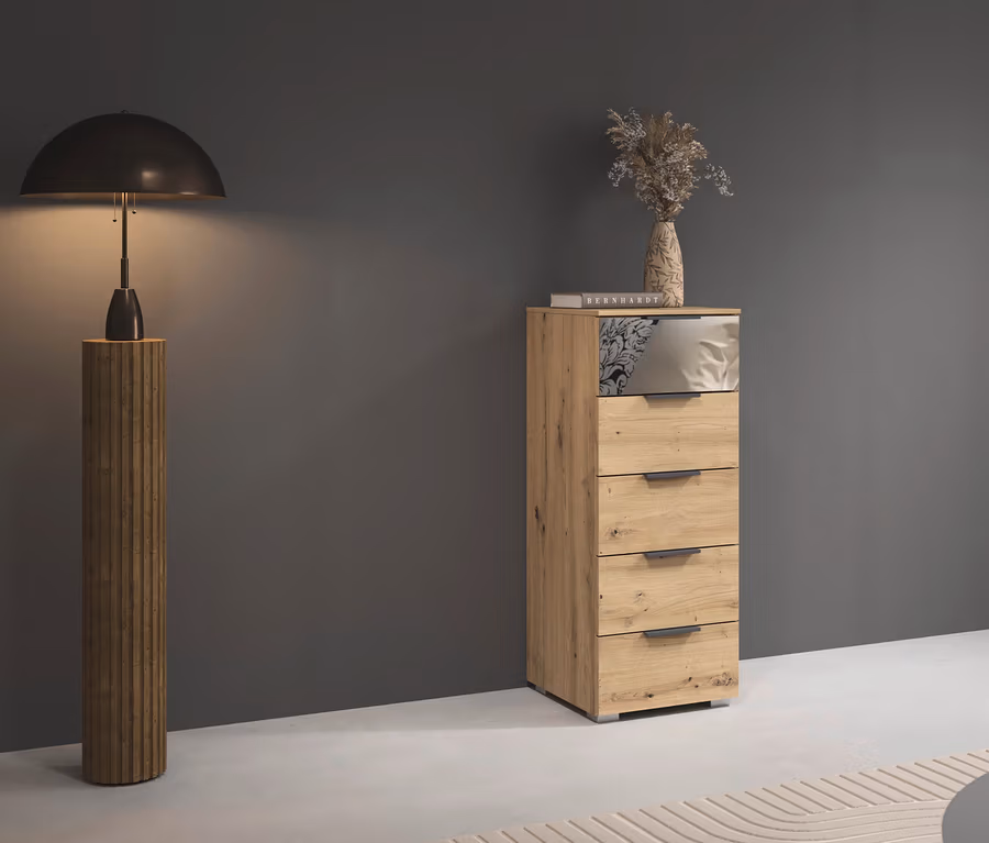 • Moderne Kommode in Eichenholzoptik mit elegantem Grauspiegel auf den oberen Schubladen