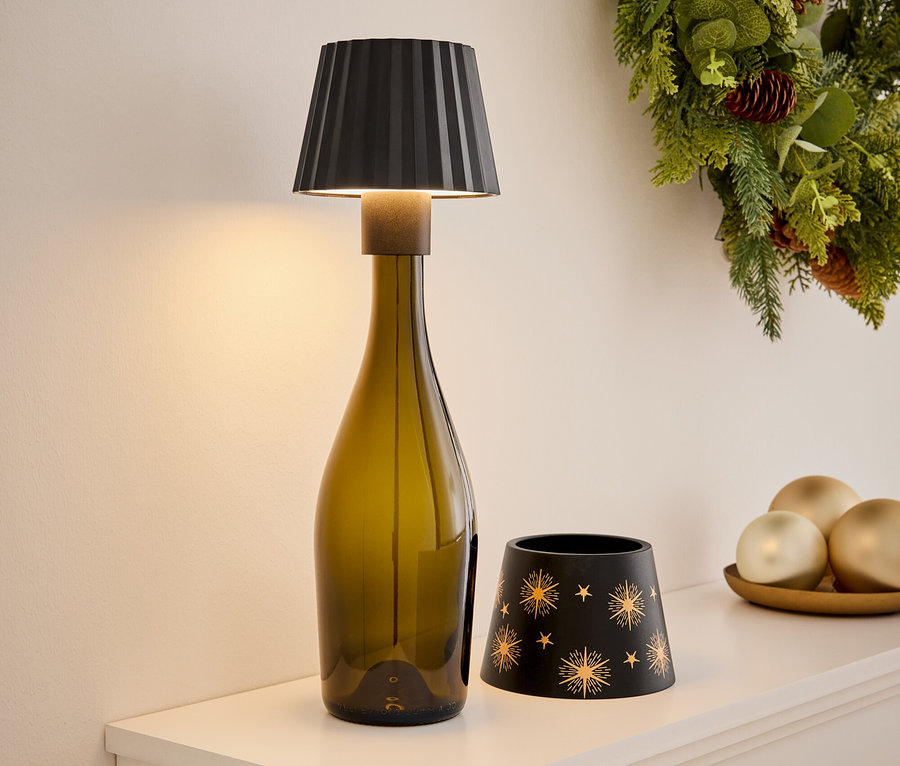 - Nur den Schirm aufstecken und die Lieblingsflasche verwandelt sich in eine dekorative Lampe