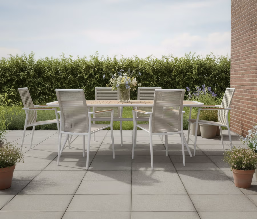 - Tisch- und Stuhlgestell aus rostresistentem Aluminium, besonders langlebig, pflegeleicht und witterungsbeständig