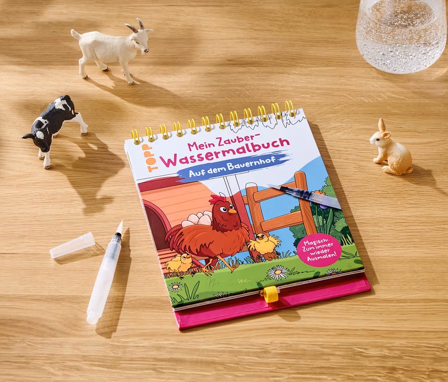 - Mit dem beigefügten Wasserstift zauberst du Farbe in die liebevoll gestalteten Bauernhof-Motive. Einfach mit der Spitze des gefüllten Wasserstifts über die Motive malen und schon werden versteckte Elemente und Details durch das Wasser sichtbar. Zusätzlich gibt es auf jedem Bild Fehler zu entdecken. Nach dem Trocknen können die Bilder erneut bemalt werden – für unendlichen Malspaß.
