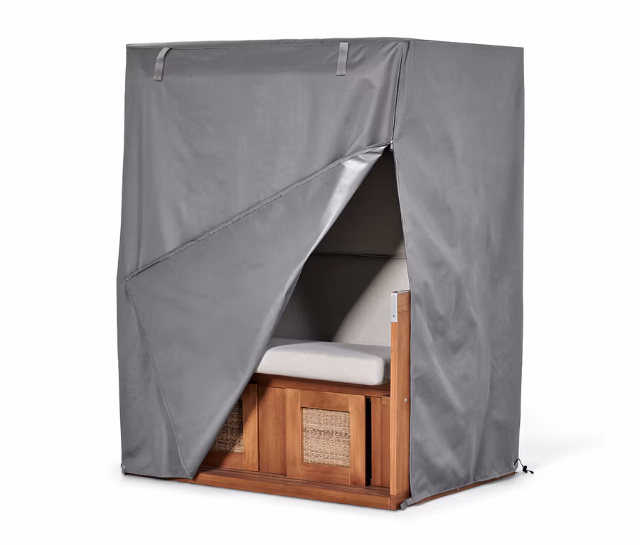- 2 Reißverschlüsse an den vorderen Ecken, ermöglicht Nutzung des Strandkorbes bei übergestülpter Abdeckhaube