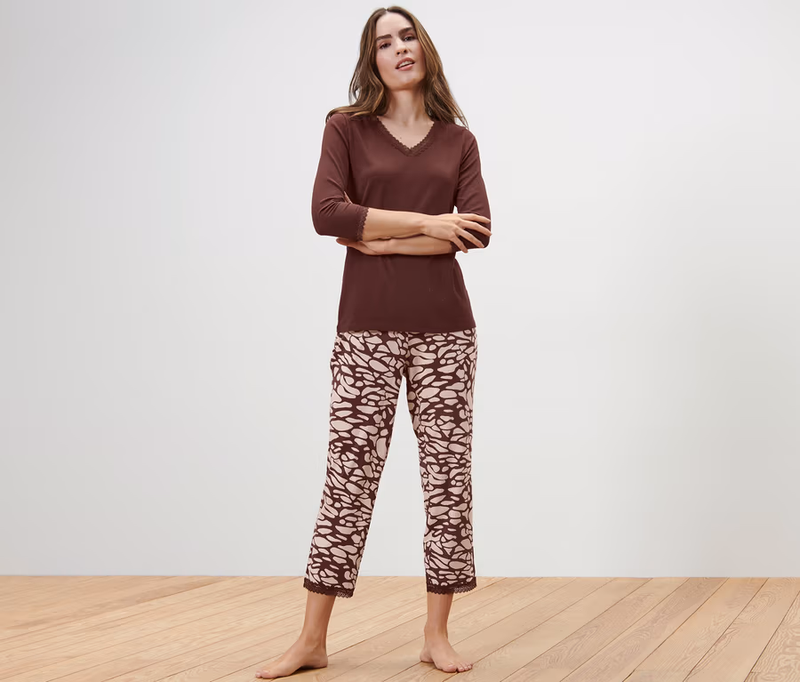 - Damenschlafanzug mit zarter Spitze an V-Ausschnitt, Arm- und Beinabschluss
