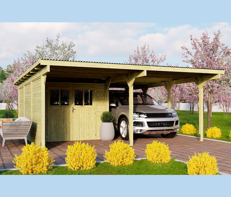 - PKW-Unterstand mit anliegendem Abstellraum und Vordach