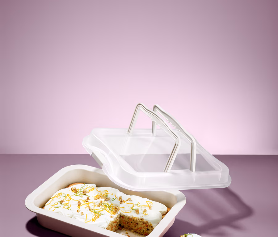 Ohne Umweg aus dem Ofen auf den Gartentisch? Mit diesem Backblech kein Problem: Man kann es im Ofen bei bis zu 230 °C als normale Backform nutzen, mit dem Deckel wird es zur Transport- und Aufbewahrungsbox.