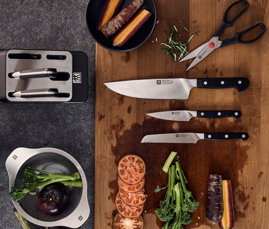 - Bestückt mit 5 hochwertigen Messern aus der Serie ZWILLING PRO und einer TWIN L Vielzweckschere
