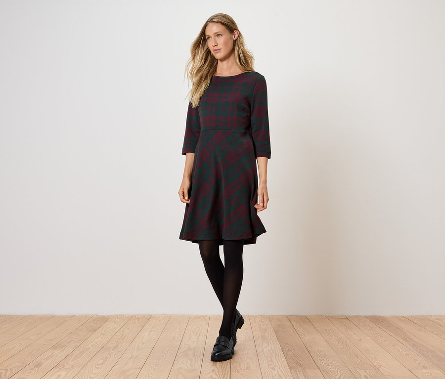 • Teilungsnaht auf Taillenhöhe mit angesetztem Rock in A-Linie