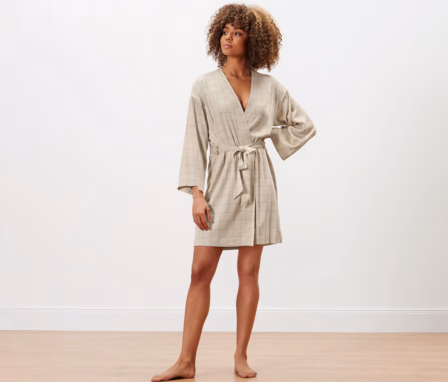 - Dieser Morgenmantel beinhaltet Fasern aus nachhaltigem Holz.