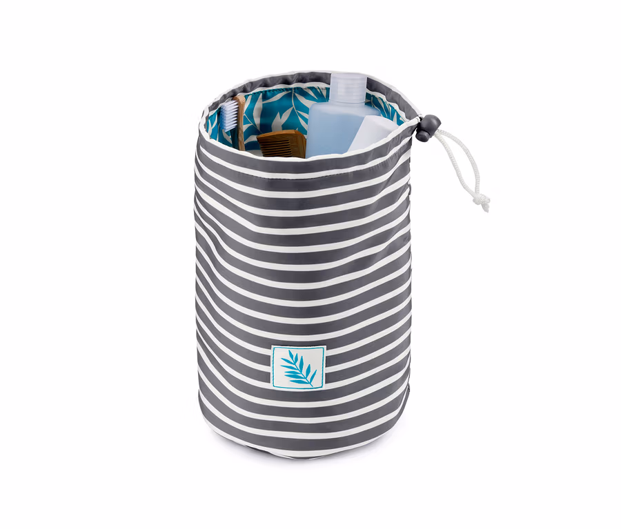 Diese 2-in-1-Kulturtasche ist auf Reisen die beste Begleitung. Die drei innenliegenden Netzfächer und Haltebänder bieten Platz für Make-up, Waschzeug, Zahnbürste und Co. Wenn mal etwas ausläuft, lässt sich das beschichtete Futter einfach feucht abwischen. Auch zu Hause ist die Tasche als Aufbewahrungskorb vielseitig einsetzbar. Blickfang hierbei: ihre Vorderseite mit dekorativem Badge. Der Kordelzug mit Stopper unterstreicht nicht nur den Dekocharakter sondern verschließt die Tasche auch sicher. Egal, wo man ist, ist die Kulturtasche nicht in Gebrauch, kann man sie platzsparend zusammenfalten und verstauen.