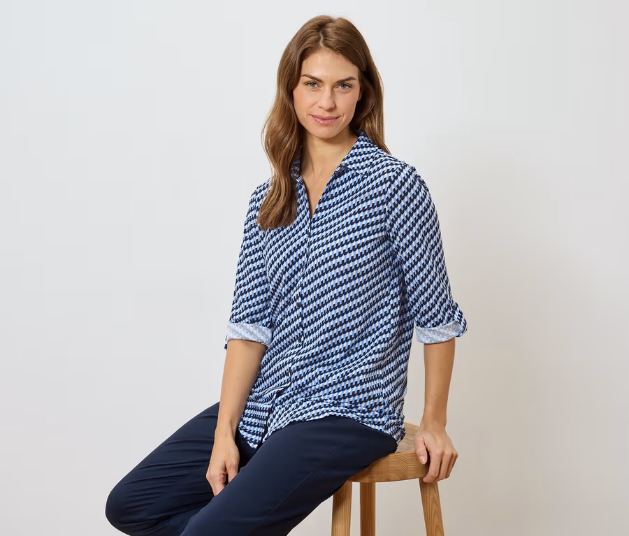 Piqué-Jerseybluse, dunkelblau-weiß-hellblauer Alloverprint
