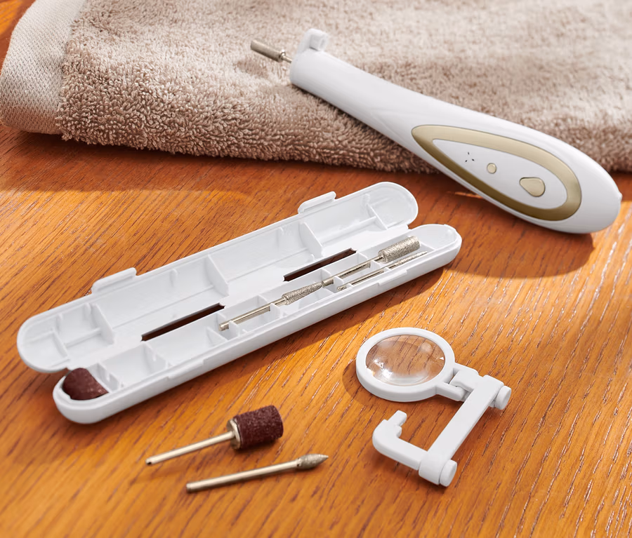 - Mit 6 auswechselbaren Aufsätzen zum Entfernen von Nagelhaut und Hornhaut