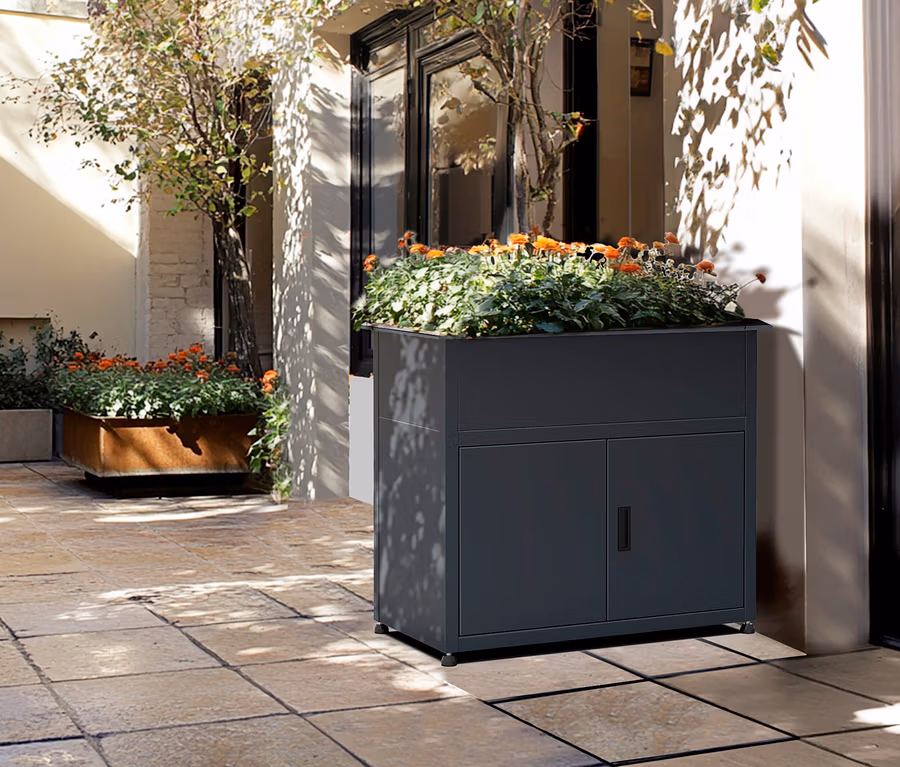 - Hochbeet mit Schneckenabwehrkante und Stauraum für Gartenutensilien