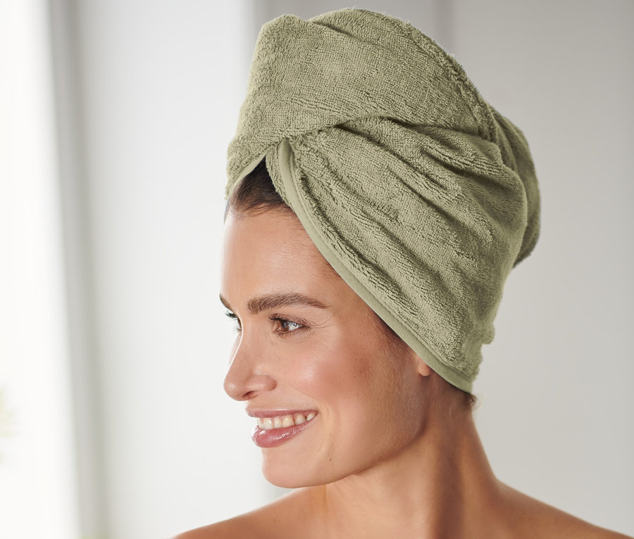 - Dieses Turban-Handtuch schützt Wasserressourcen.