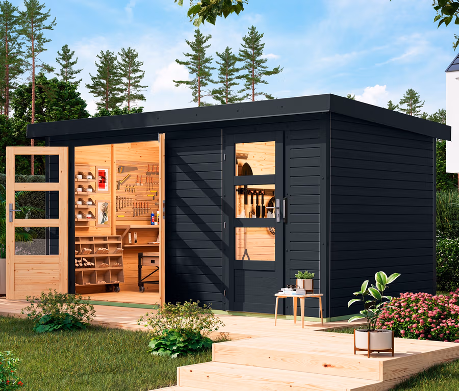- Karibu-Farbsystem: Die Anthrazit-Farbe schützt das Holz vor Witterung sowie UV-Strahlen, ist feuchtigkeitsregulierend und wasserabweisend, außerdem ist sie geruchslos und frei von allen bekannten problematischen Substanzen