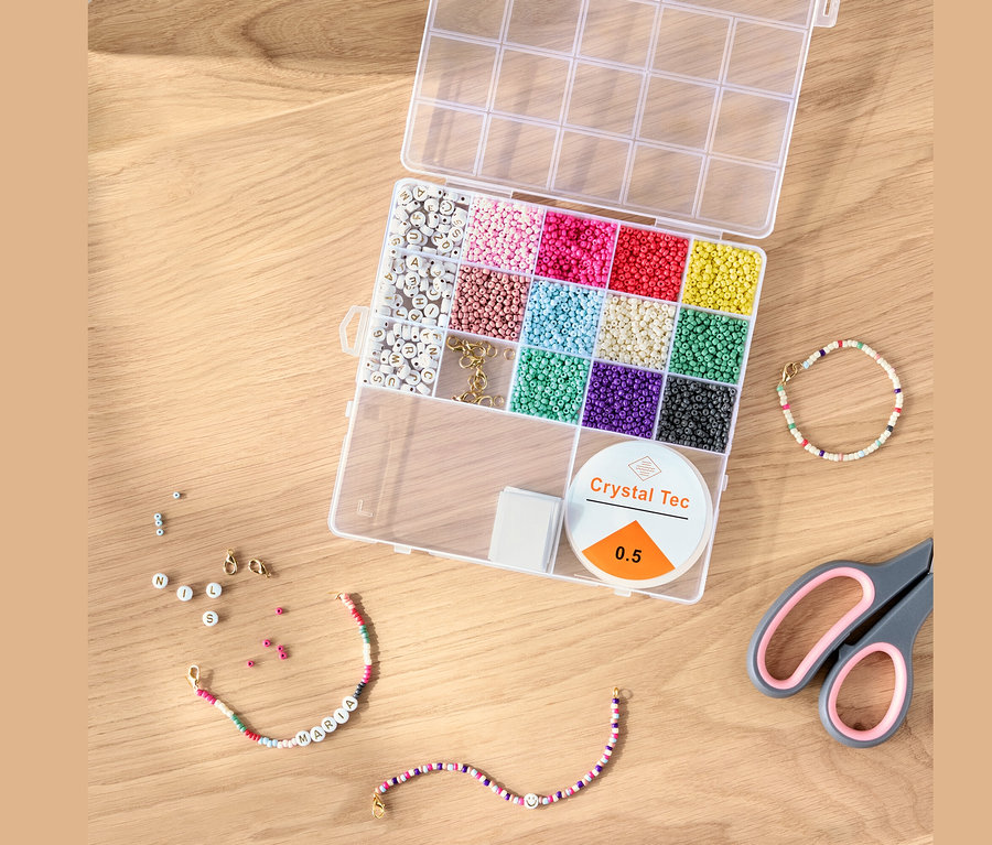 - Beinhaltet 11 verschiedene Perlen-Farben, Buchstaben-Perlen, Smiley-Perlen, Verschlüsse und ein elastisches Band