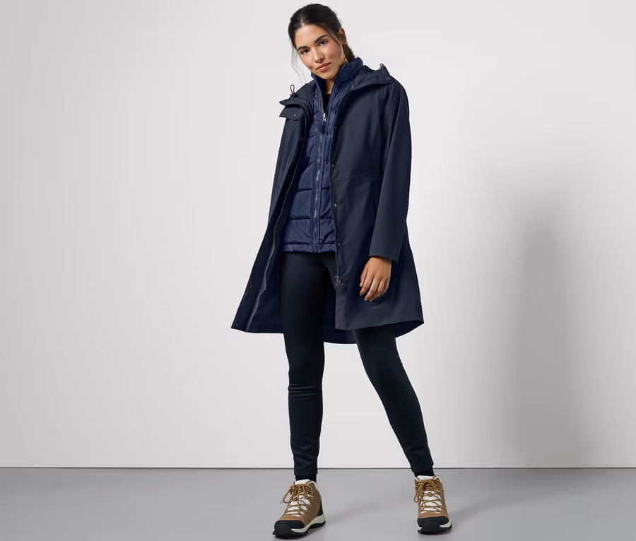 - Regenmantel und Steppweste einzeln oder in Kombination tragbar