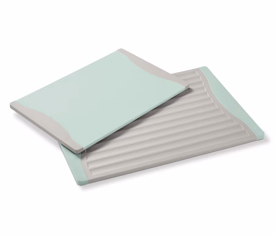 Bei dem großen Brett kommt noch hinzu, dass es eine Seite mit Rillenstruktur hat, die zum Beispiel zum Auffangen von Flüssigkeiten oder Brotkrümeln dienen kann. Beide Bretter sind beidseitig verwendbar – und mit ihren modernen, frischen Pastellfarben lassen sie sich auch wunderbar zum Servieren nutzen.
