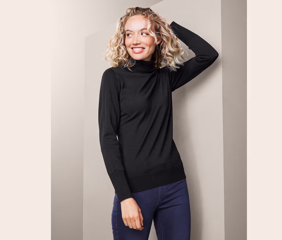 • Rippbündchen an Ärmelabschluss, Saum und Rollkragen