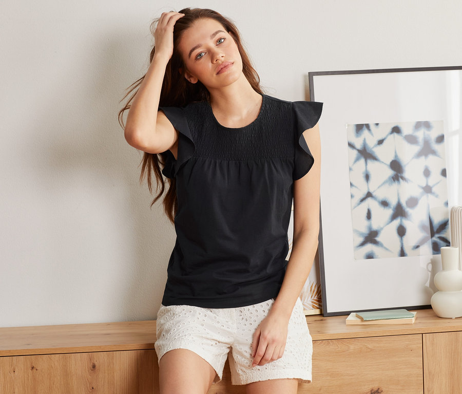 - Gesmokte Brustpasse und Flügelärmel in leichter Webqualität