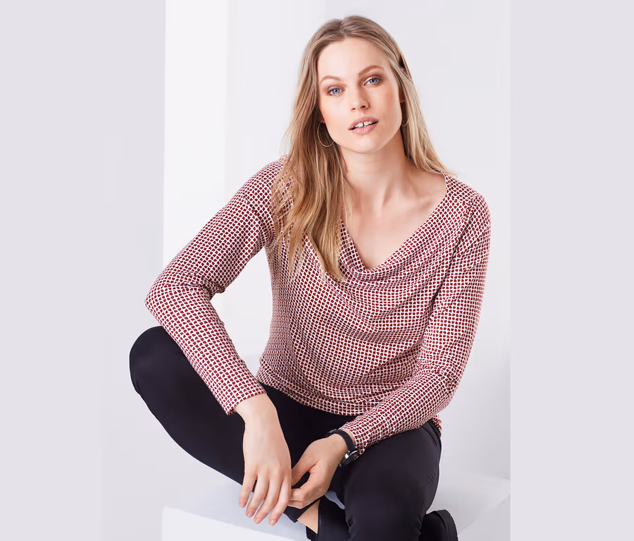 Dieses Shirt mit Wasserfall-Ausschnitt bereichert jeden Kleiderschrank um einen Grund, sich über fallende Temperaturen zu freuen. Das Oberteil mit geradem Saum ist in weich fließender Viskose-Mischqualität gefertigt und mit einem dekorativen Minimalprint verziert. Highlight des Shirts ist der leicht fallende Ausschnitt, der für einen besonders femininen Look sorgt.