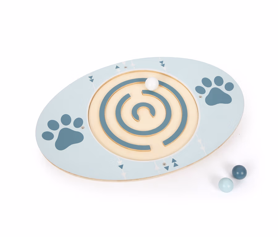 - Steigerung des Schwierigkeitsgrads durch 3 Holzkugeln, die durch geschickte Gewichtsverlagerungen durchs Labyrinth geführt werden können