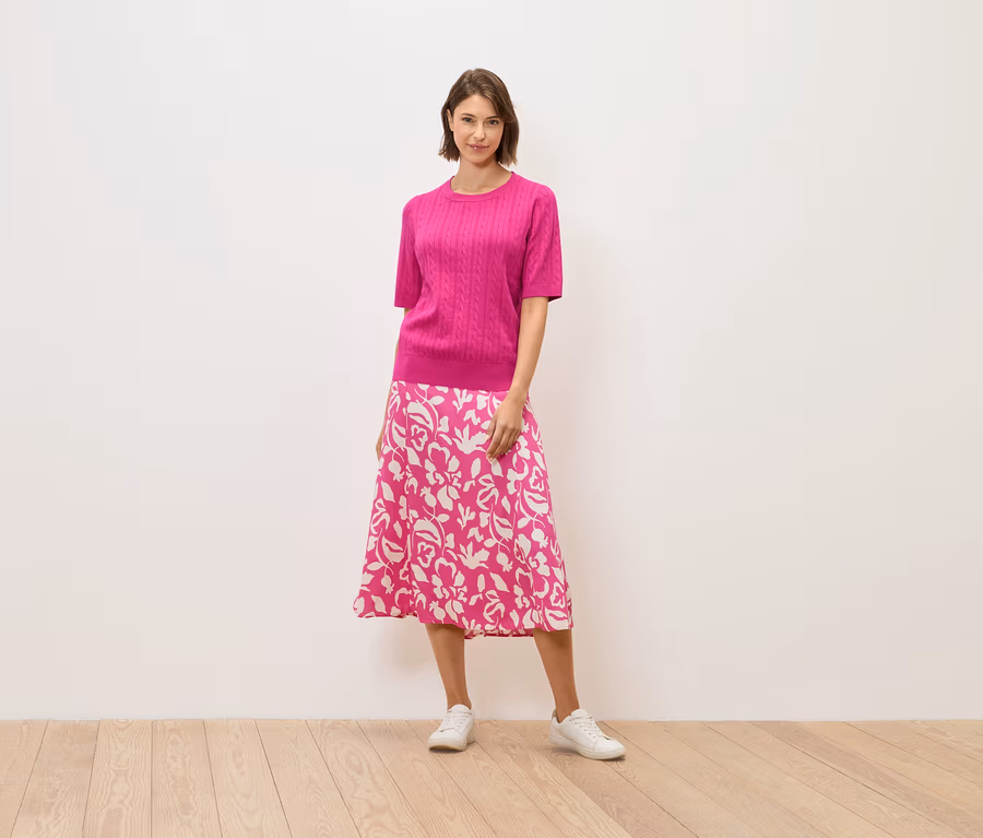 • Elastische Rippbündchen an Ausschnitt, Ärmelabschluss und Saum