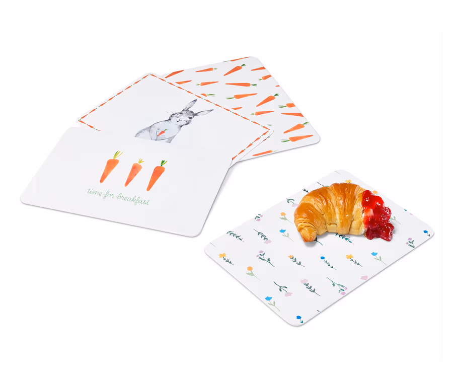 • 4 verschiedene dekorative Designs: 1x Häschen, 1x Karotten-Alloverdekor, 1x Karotten und »Time for Breakfast«-Schriftzug, 1x florales Alloverdekor