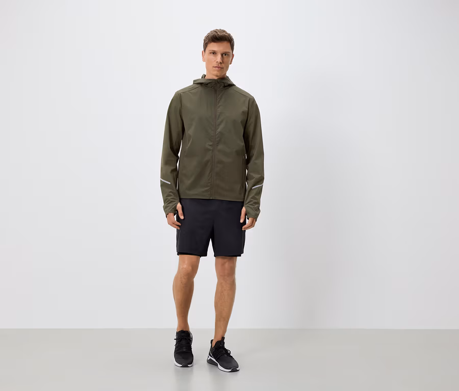 - Hoch schließender Reißverschluss mit Kinnschutz, Stehkragen und Kapuze
