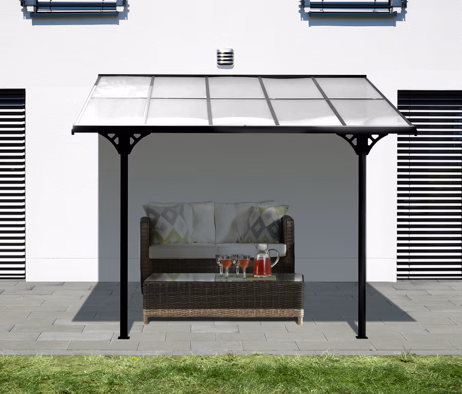 Extrem stabile Terassenüberdachung in neuartigem Design. Massive Konstruktion aus pulverbeschichtetem Aluminium. Geringer Wartungsaufwand.Trägt Schneelasten bis zu 50 kg/m². Die 6 mm starken Polycarbonat Doppelstegplatten mit 30% UV-Schutz und 75% Lichtdurchlässigkeit sorgen für hohen Lichteinfall und eine angenehme Sitzatmosphäre. Die wählbare Dachneigung von 225 bis 270 cm passt sich allen Gegebenheiten an.Ortsspezifische baurechtliche Regeln müssen ggf. geprüft werden.