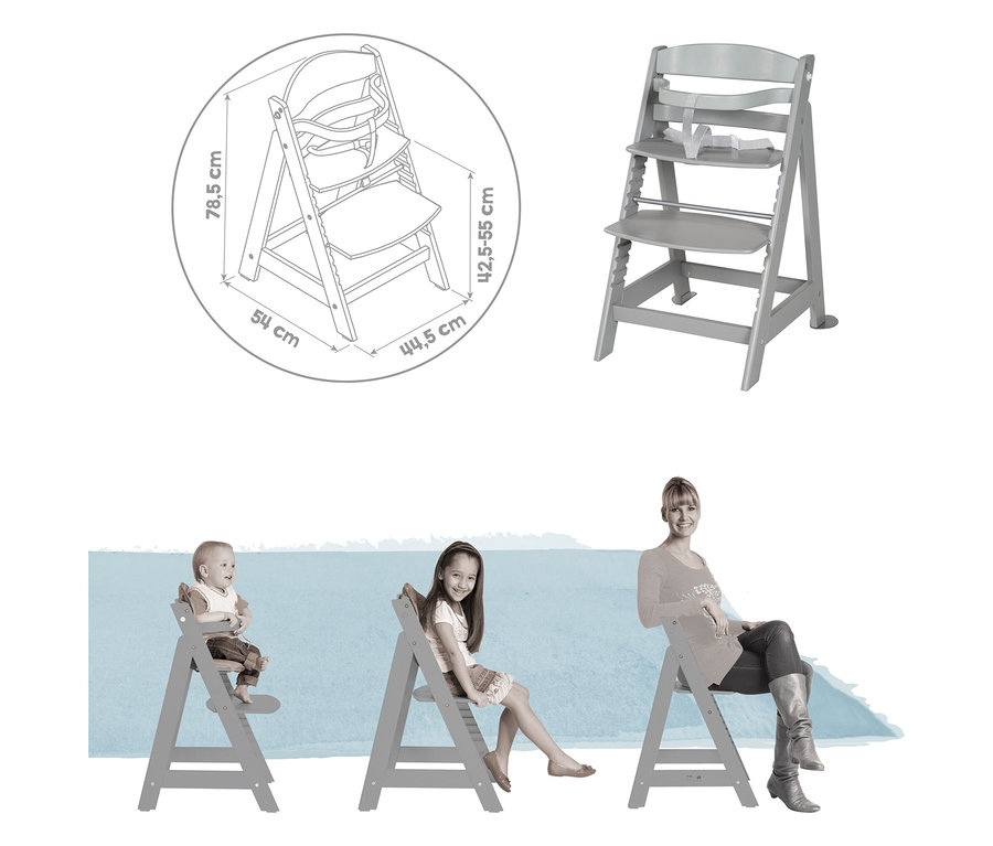 - Wächst nach einfacher Abnahme von Schutzbügel und Gurtsystem durch das höhenvariable, herausnehmbare Sitz- bzw. Fußbrett stufenweise zum Jugendstuhl heran