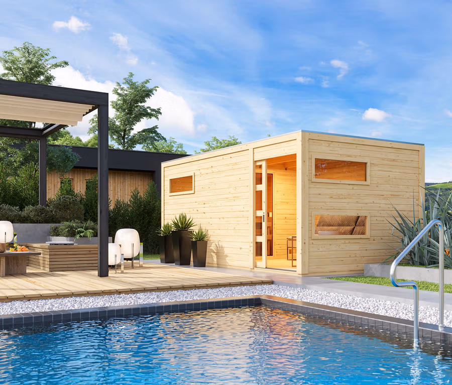 - Effiziente Wärmespeicherung durch starke 38-mm-Massivholzwände und mineralwollgedämmte Saunadecke