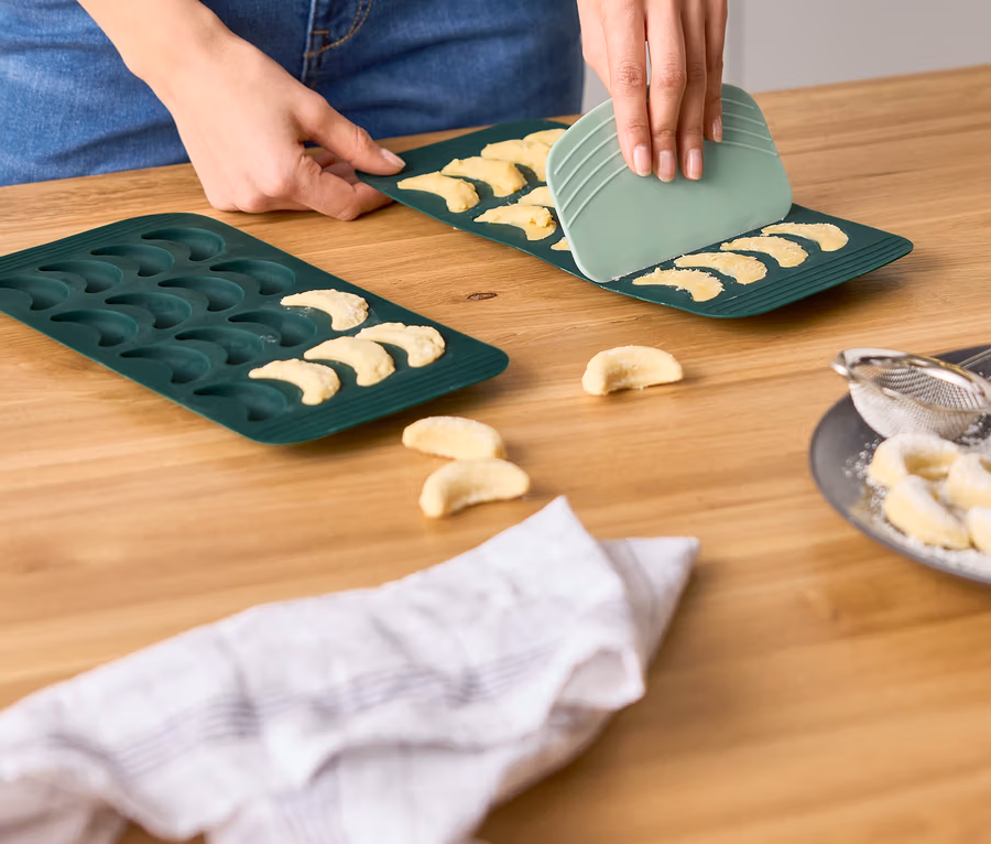 - Teig in die Formen streichen – die Ausformungen ergeben gleichmäßige Vanillekipferl