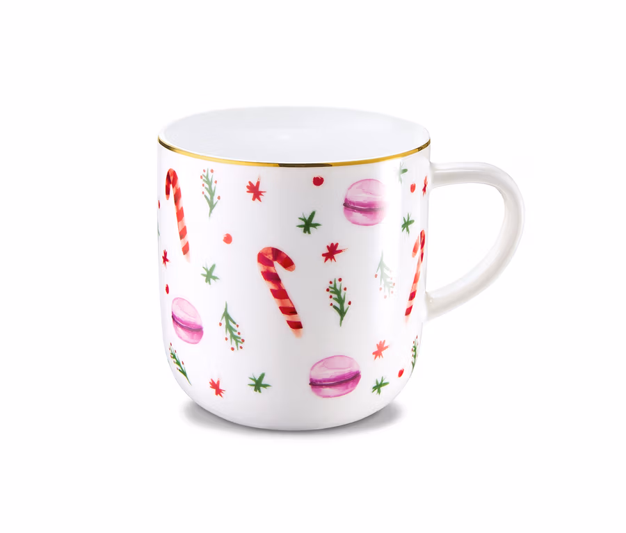 Der Becher ist mit einem weihnachtlichen Aquarell-Motiv verziert, das fast wie von Hand gemalt aussieht. Der Becherrand ist mit rundumlaufendem Glanzgolddekor versehen – so macht er sich perfekt auf jeder Feiertagstafel, vom Frühstück bis zur Tea-Time.