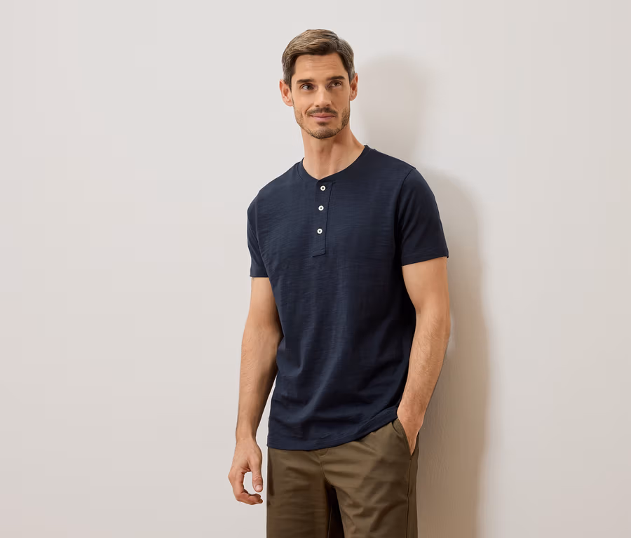 • Ausschnitt mit Rippbündchen und Knopfleiste