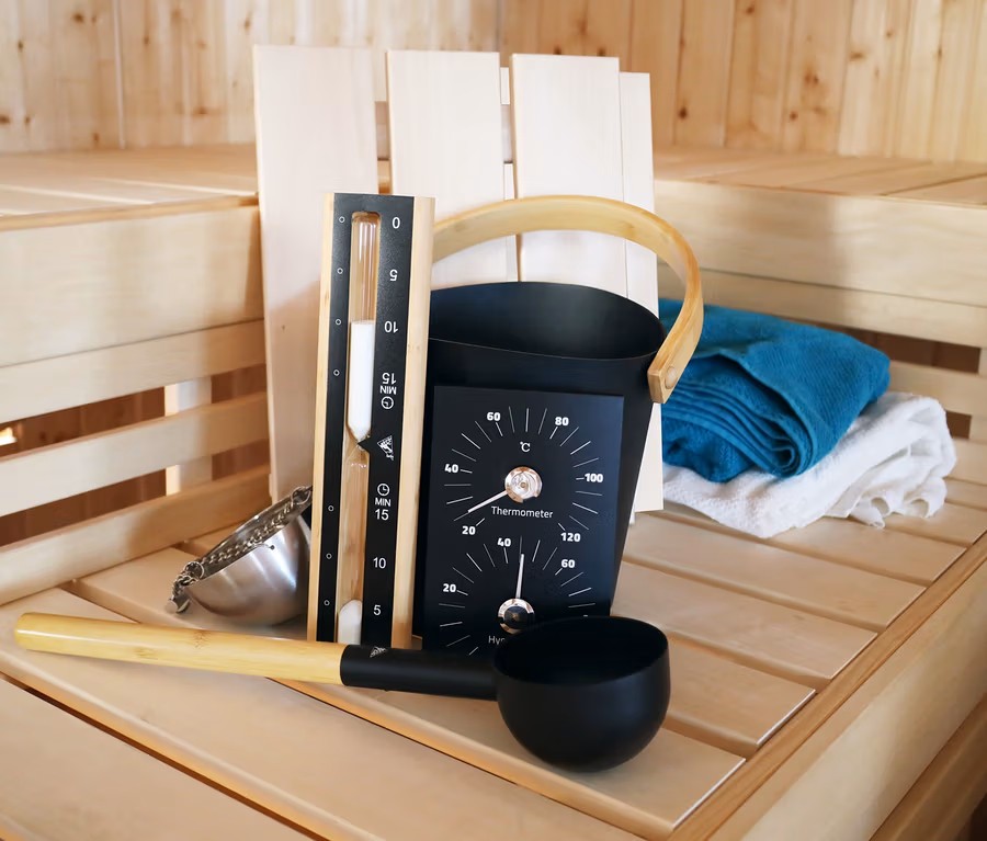 - 7-teiliges Zubehör-Set für das perfekte Saunaerlebnis im eigenen Heim