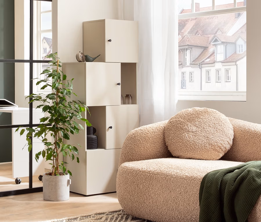 - Schieberegal in Cremebeige, Breite variabel anpassbar
