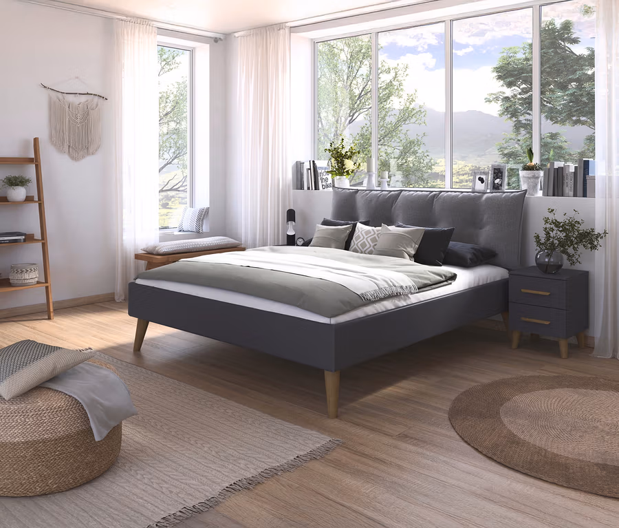 - Modernes Bett mit bequem gepolstertem Bettkopfteil in Hellgrau