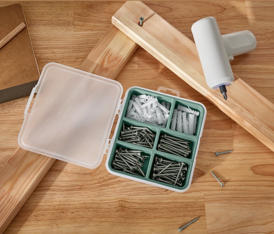 Inkl. Rundkopfschrauben 10x je 4,5 x 50 mm, 30x je 4,5 x 40 mm, 20x je 4 x 30 mm, Senkkopfschrauben 10x je 4,5 x 50, 30x je 4,5 x 40 mm, 20x je 4 x 30 mm, Dübel 10x je 8 x 38,8 mm, 45x je 5,8 x 30 mm