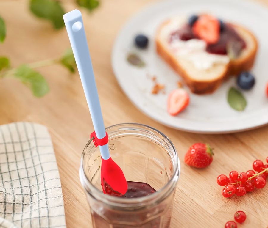 - Mit speziell geformter Laffe aus elastischem Silikon zum restlosen Leeren von z.B. Marmeladengläsern
